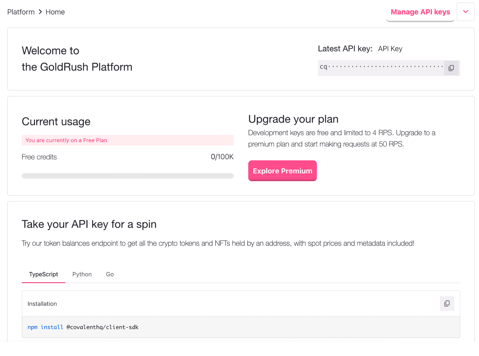 Before using the GoldRush API, you need to register for an account and obtain an API key. Visit the GoldRush website (opens in a new tab) and click the "Signup for free API Key" button. Follow the prompts to fill in the necessary information and submit your application.